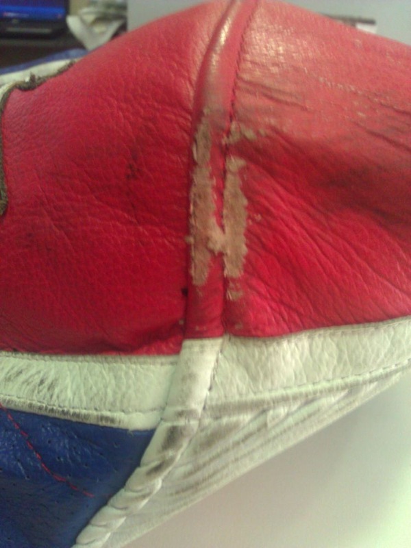 Estas imágenes muestran la prenda una vez ya ha sido limpiada. Algunas de las fotografías muestran el inicio del proceso de recuperación de los rasguños y agujeros. Logos, y pequeños detalles son reparados con meticulosidad.