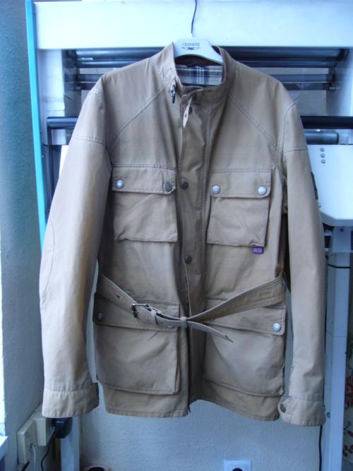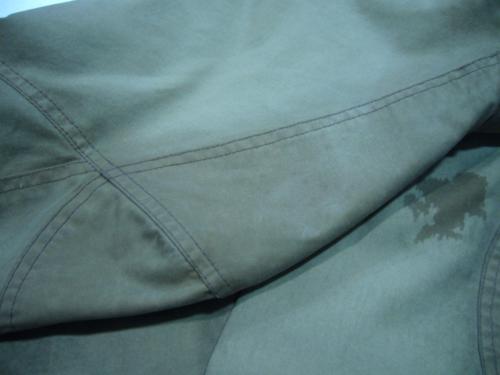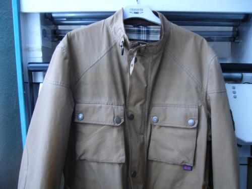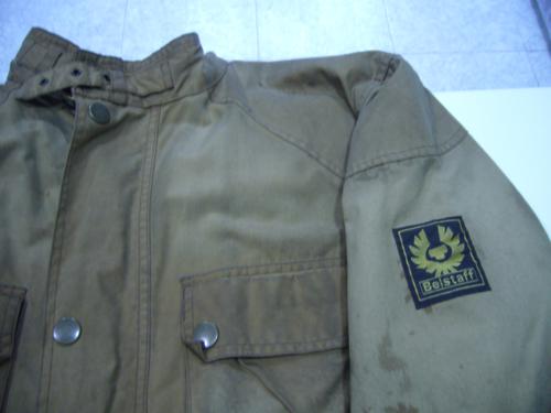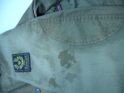 Hemos recuperado este belstaff el cual nos llego muy sucio, decolorado, con el impermeabilizante dañado, y con zonas verdes de moho y oxido. La prenda presentaba sintomas evidentes de haber sido lavada en agua de forma inadecuada y con una clara perdida de cera e impermeabilización, con una suciedad que ha penetrado mas alla de lo recomendable y consecuentemente con un olor desagradable y molesto que no hacia posible su empleo.